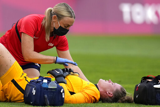 Starting goalkeeper Alyssa Naeher came down awkwardly trying to go up for the ball in front of her goal in the 20th minute.