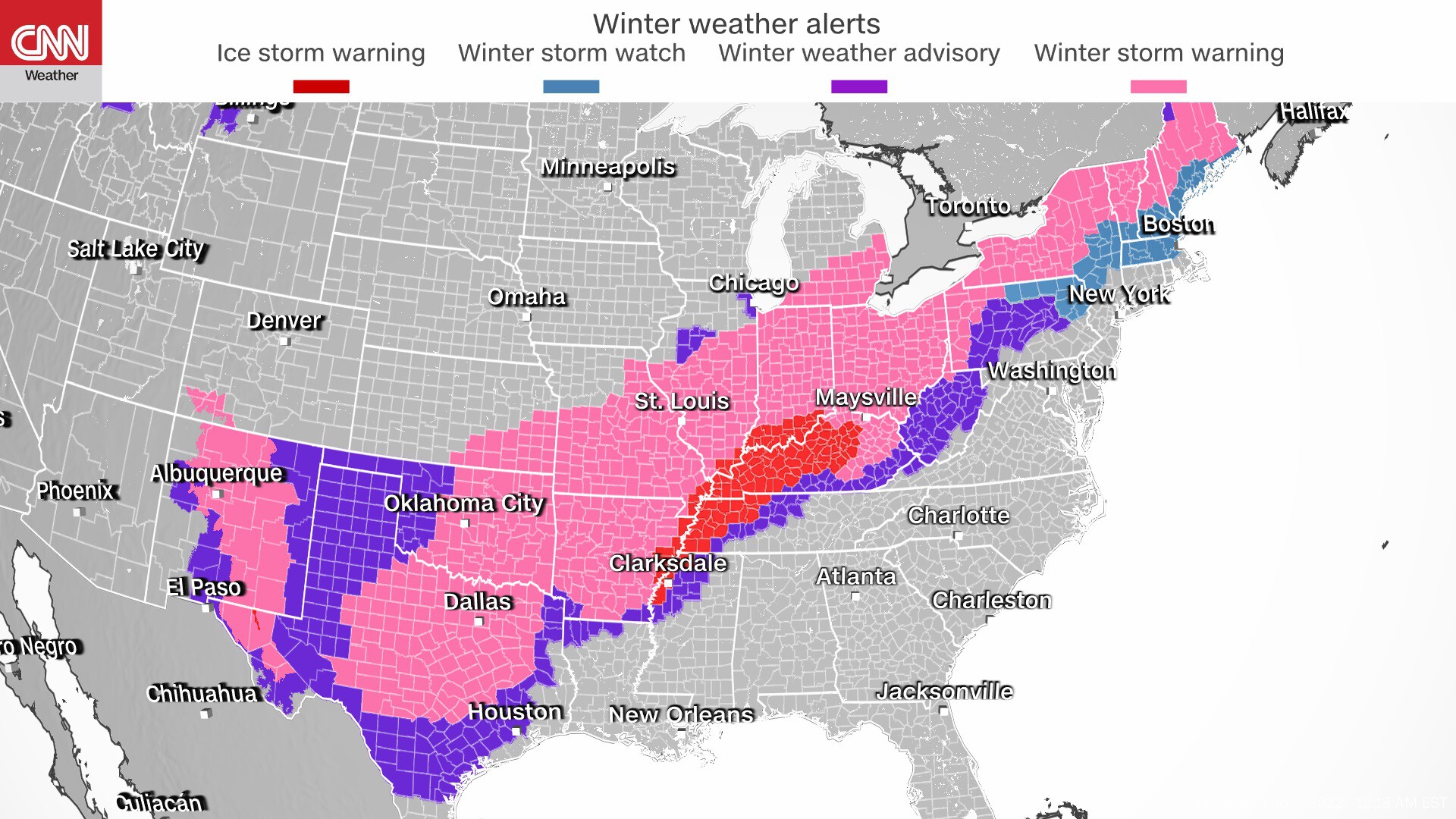 More than 100 million people in 25 states stretching from the Mexican to Canadian borders were under winter weather alerts Thursday, CNN meteorologist Monica Garrett said.