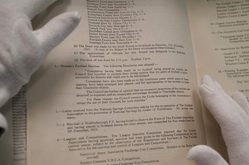 The display is part of an effort to mark the 100th anniversary of the Football Association’s decision to ban women from playing matches at the stadiums of Football League clubs because the game was considered “unsuitable for females.” The ruling wasn’t lifted until 1971.